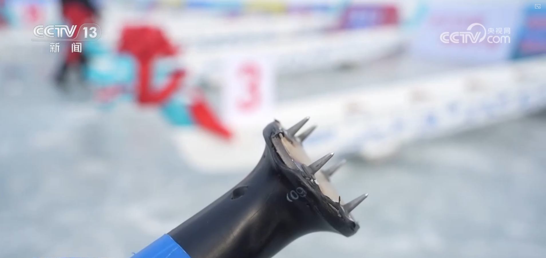 随着裁判一声令下,运动员们全力挥动手中的冰钎扎向冰面,龙舟快速向前冲去。冰上龙舟每艘长度在10米,比赛时配有鼓手、舵手和划手,与传统水上龙舟不同,冰上龙舟的核心装备是安装在船体下方的冰刀和运动员手中的特制冰钎。