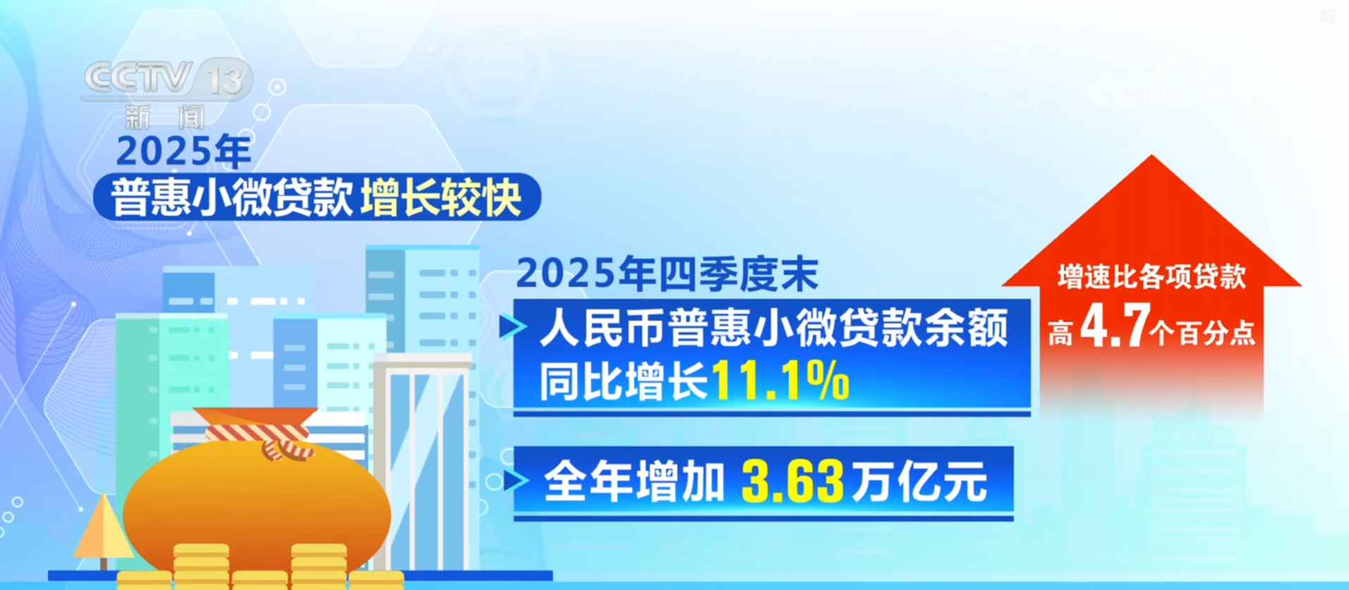 2025年,普惠小微贷款增长较快。2025年四季度末,人民币普惠小微贷款余额同比增长11.1%,增速比各项贷款高4.7个百分点,全年增加3.63万亿元。