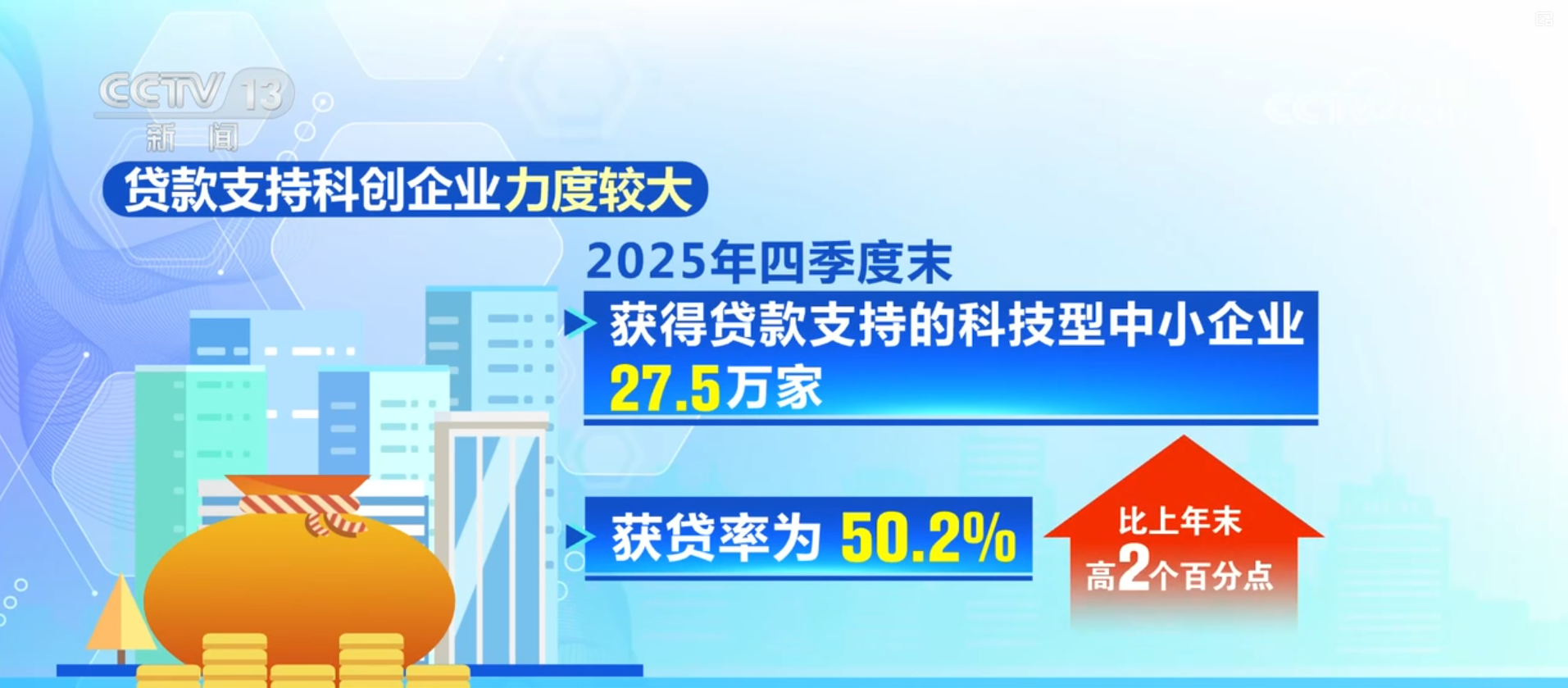 贷款支持科创企业力度较大。2025年四季度末,获得贷款支持的科技型中小企业27.5万家,获贷率为50.2%,比上年末高2个百分点;获得贷款支持的高新技术企业26.54万家,获贷率为57.3%,比上年末高0.4个百分点。