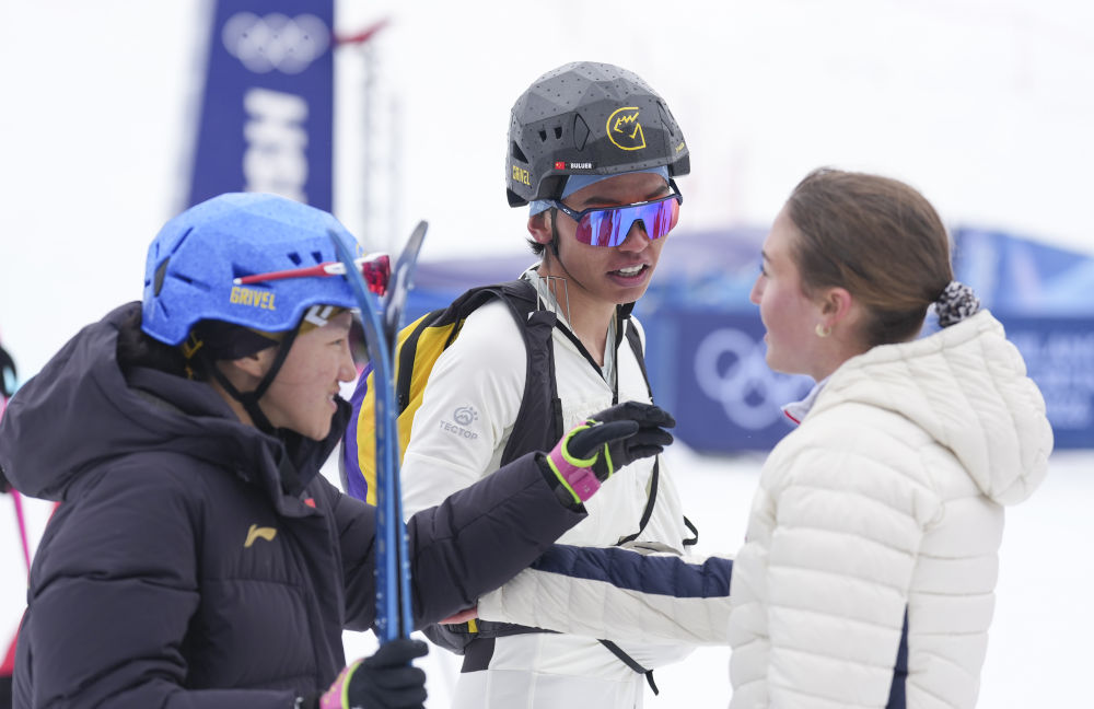 米兰-科尔蒂纳冬奥会滑雪登山混合接力比赛后,次旦玉珍(左)、布鲁尔(中)与其他参赛选手交流(2026年2月21日摄)。新华社记者 胡虎虎 摄