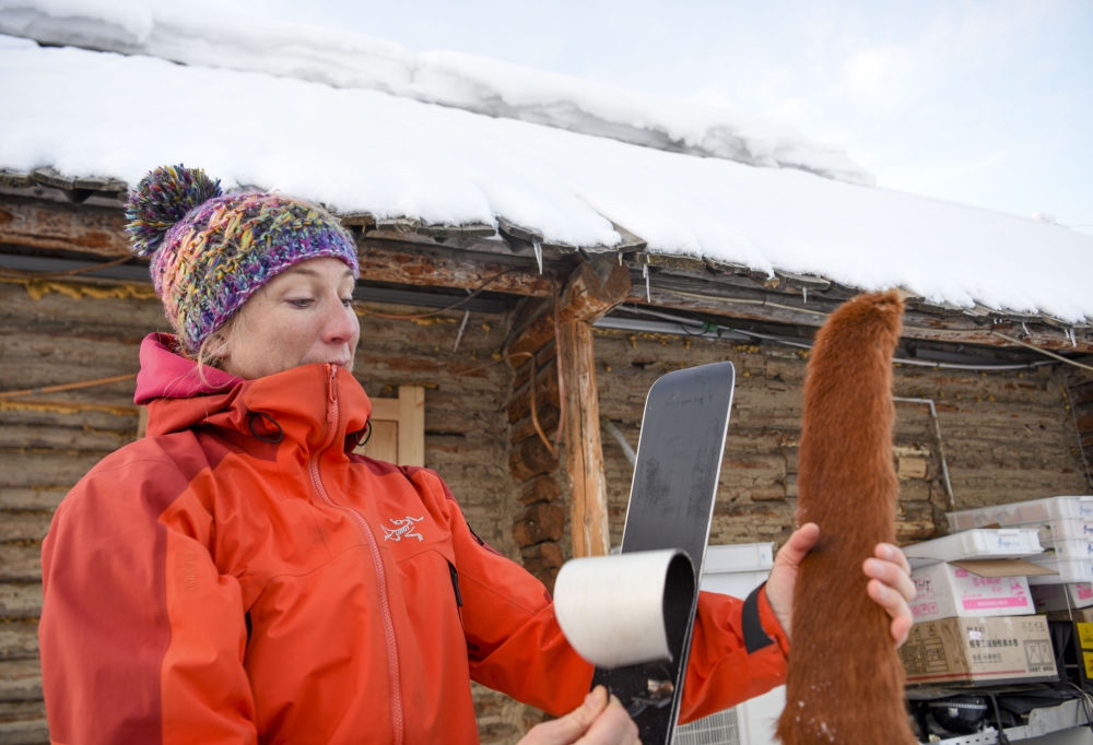 在新疆阿勒泰地区禾木村,一位法国雪友比较现代滑雪板的止滑带与古老毛皮滑雪板的异同(2019年1月11日摄)。新华社记者 胡虎虎 摄
