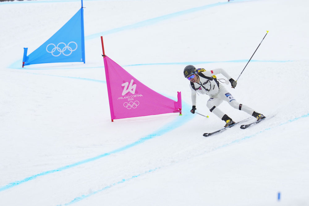 2026年2月21日,布鲁尔在米兰-科尔蒂纳冬奥会滑雪登山混合接力比赛中。新华社记者 胡虎虎 摄