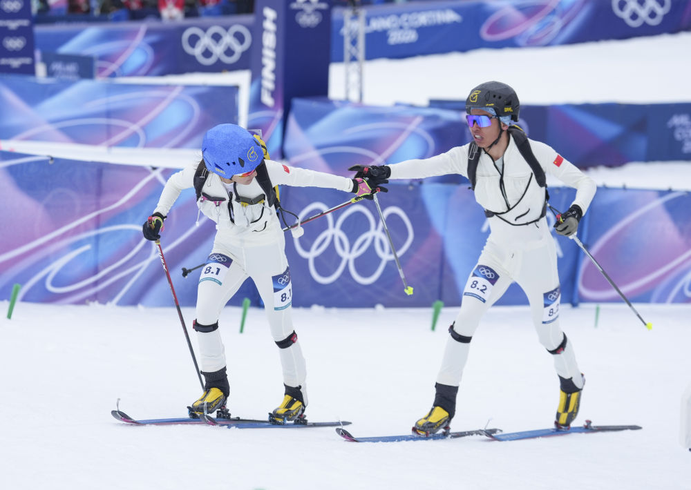 获得米兰-科尔蒂纳冬奥会滑雪登山混合接力比赛第八名的中国组合次旦玉珍(左)/布鲁尔在终点处合影(2026年2月21日摄)。新华社记者 胡虎虎 摄