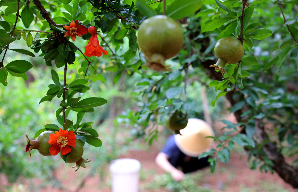 果农在山东枣庄峄城石榴园的石榴树下劳作(2025年6月18日摄)。 新华社发(孙中喆 摄)