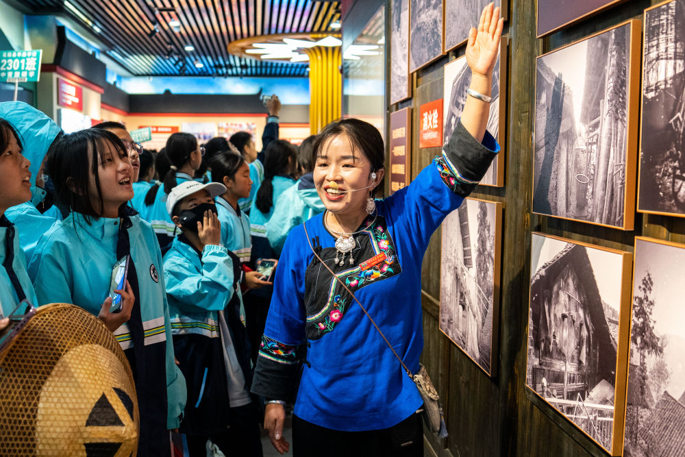 在湖南湘西十八洞村,讲解员施艳琴为游客讲解十八洞村的故事(2023年11月1日摄)。 新华社记者 陈思汗 摄