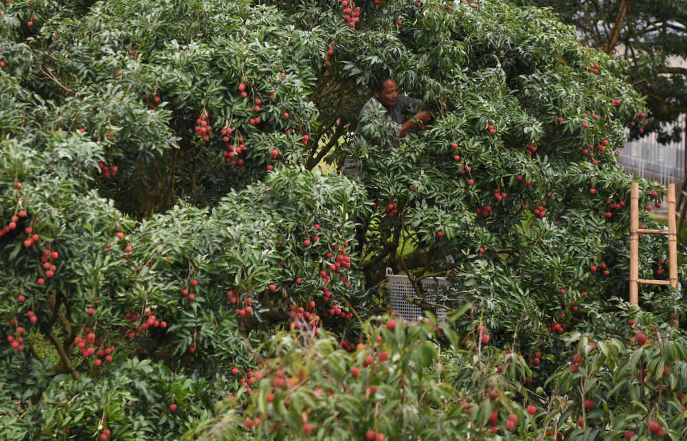 果农在广东茂名高州名园生态园采摘荔枝(2025年6月4日摄)。 新华社记者 邓华 摄