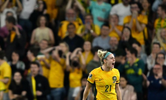 2023年8月12日,女足世界杯四分之一决赛,澳大利亚队球员卡彭特在点球大战中庆祝罚入点球。新华社记者 李一博 摄
