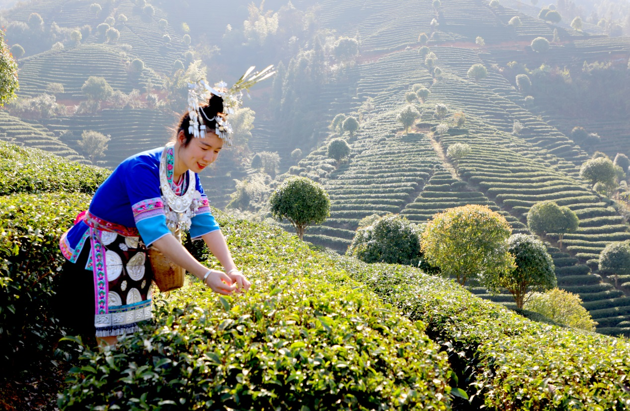 三江生态种植茶基地姑娘正在采茶。邓蕾雅 摄