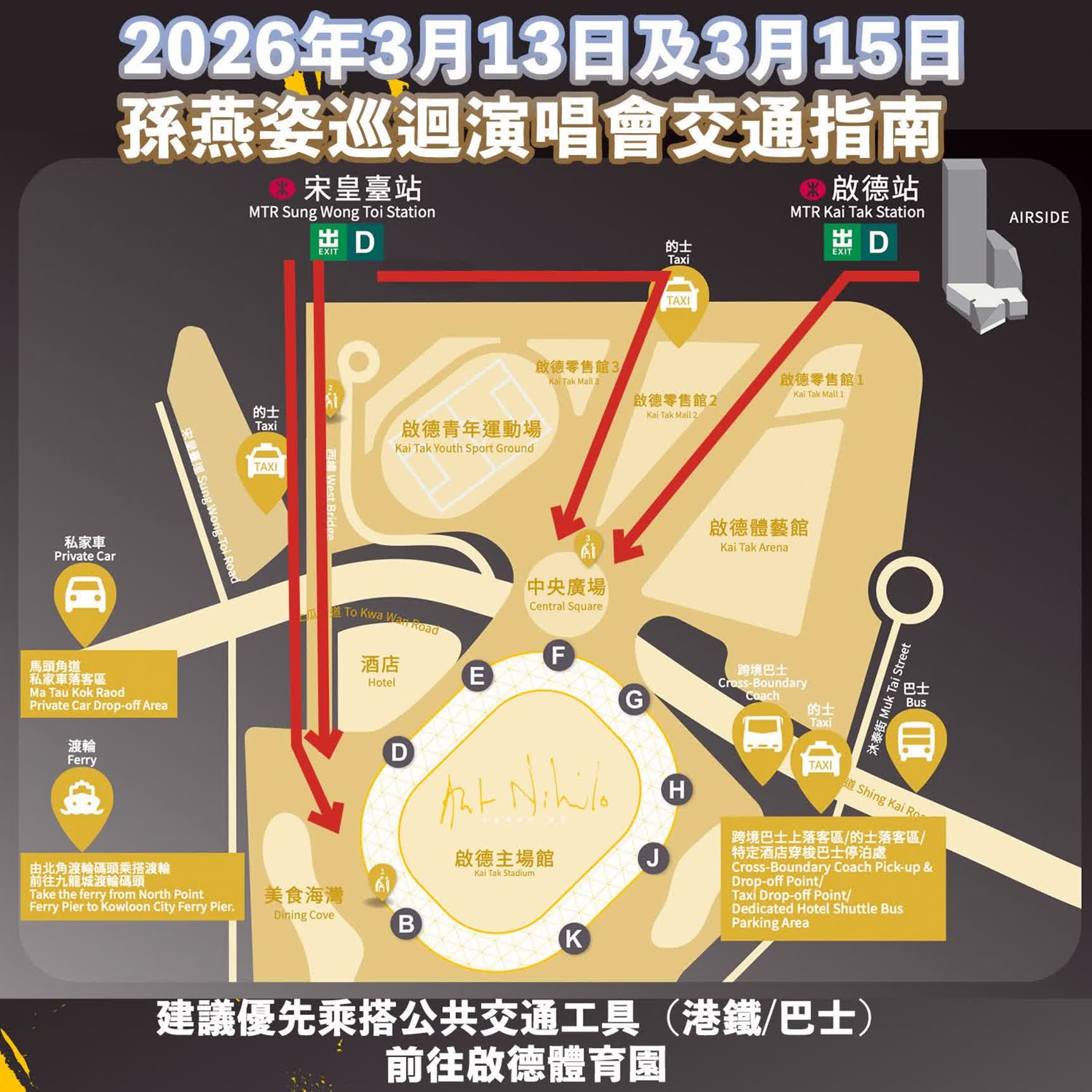 - 由於演出在07:30PM開始,預計10:30PM後結束。觀眾除可在宋皇臺站或啟德站搭乘往羅湖方向的列車,也可選乘港鐵往上水方向,或搭乘巴士路線SP12前往新田。