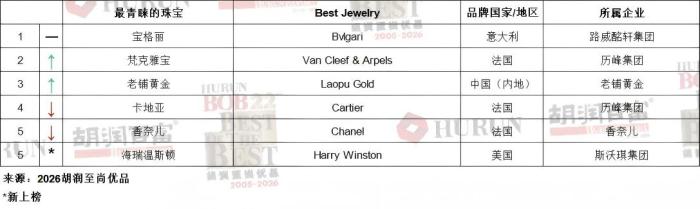 截图自“胡润百富”微信公众号。胡润研究院最新发布的《2026胡润至尚优品—中国高净值人群品质生活报告》显示,在高净值人群最青睐的珠宝品牌榜单中,老铺黄金超越法国品牌卡地亚,首次进入前三甲。