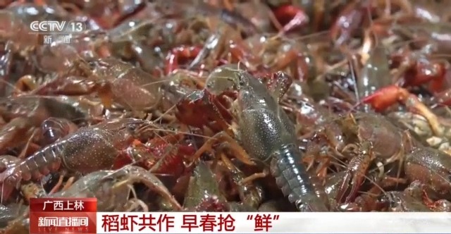 在广西南宁市上林县的一家水产养殖基地,养殖户从田里将小龙虾捕捞上岸后要快速进行分拣、装箱,发往上海、深圳等地。据介绍,从正月初九开始,就有客户前来采购小龙虾,日销量在1500公斤到2000公斤。近年来,当地采用“稻虾共作”的生态种养模式,养出的虾壳亮肉厚、清甜无泥腥味,既满足了市场需求,也让群众实现了在家门口就业。