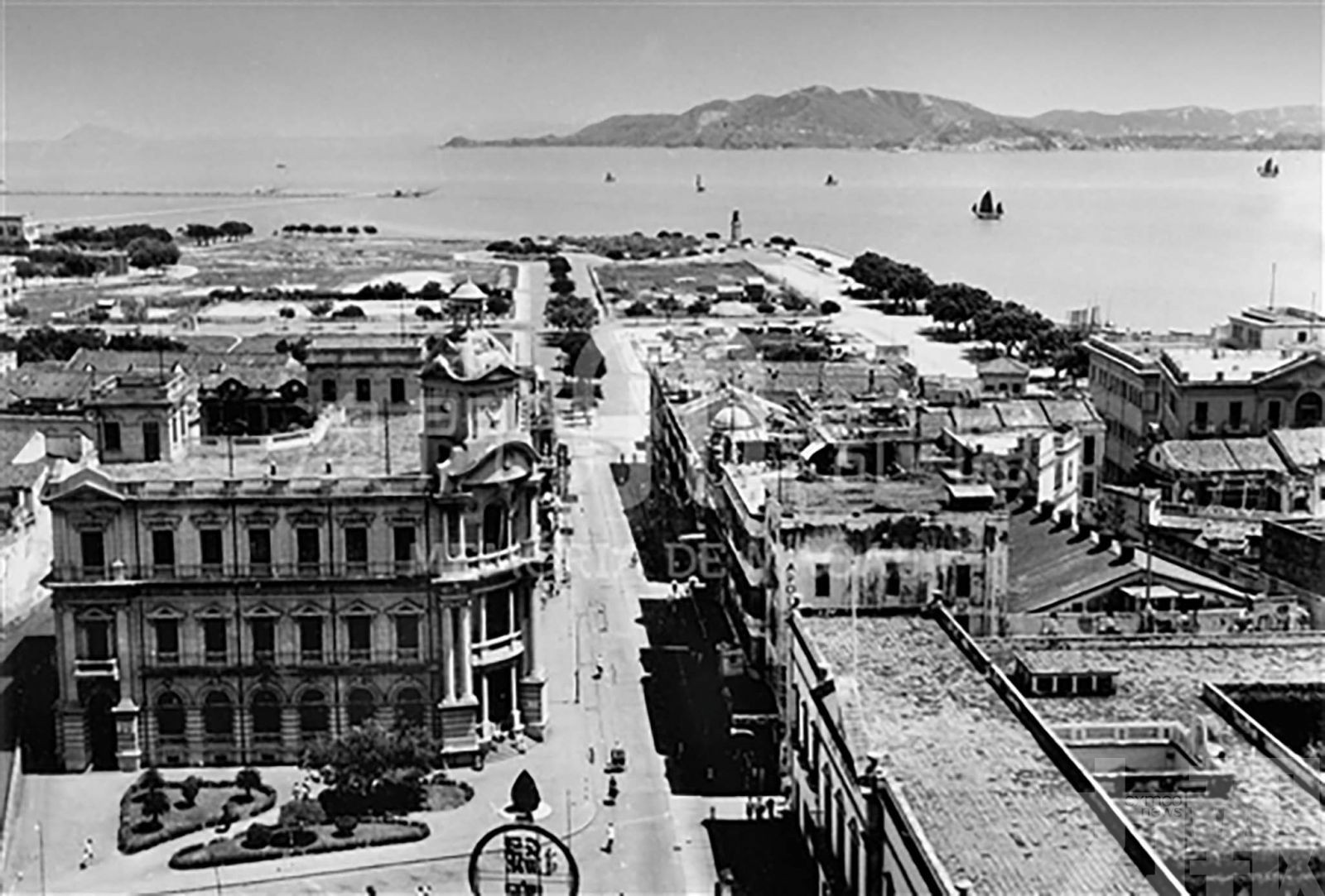 上 世 紀40年 代, 郵 政 局 總 部 大 樓(左下)已成為新馬路一帶最具標誌性的古典建築之一。(李玉田攝,澳門攝影學會提供,摘自「 澳門記憶 」文史網)