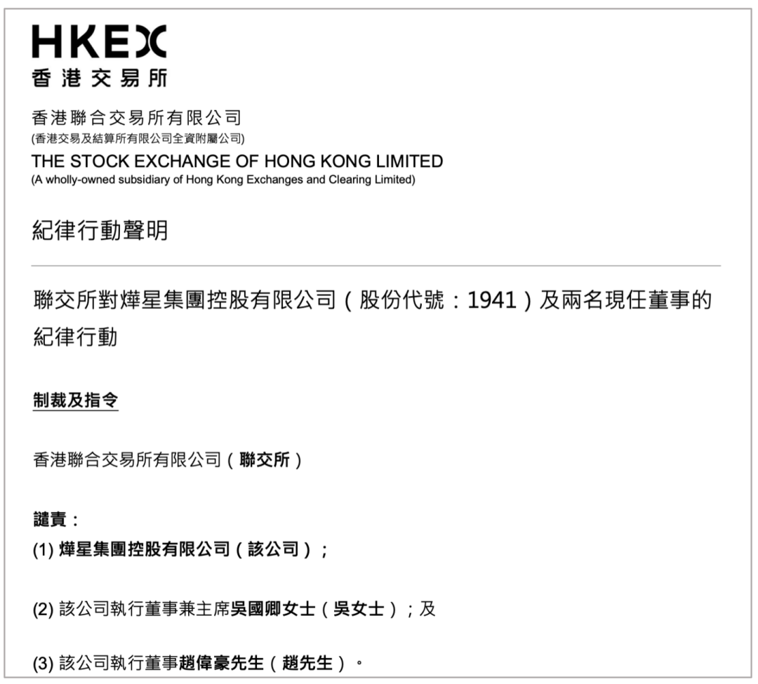 联交所的处罚包括:公开谴责,以及完成24小时培训,内容涵盖董事职责、《企业管治守则》及《上市规则》关于关连交易的规定。