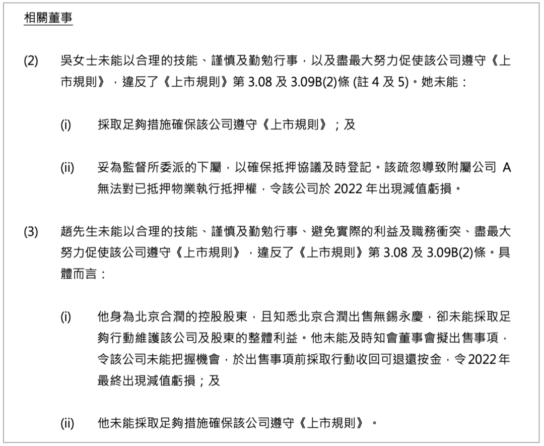 联交所对他的裁定是:未能以合理的技能、谨慎及勤勉行事、避免实际利益与职务的冲突,以及尽最大努力促使公司遵守《上市规则》。
