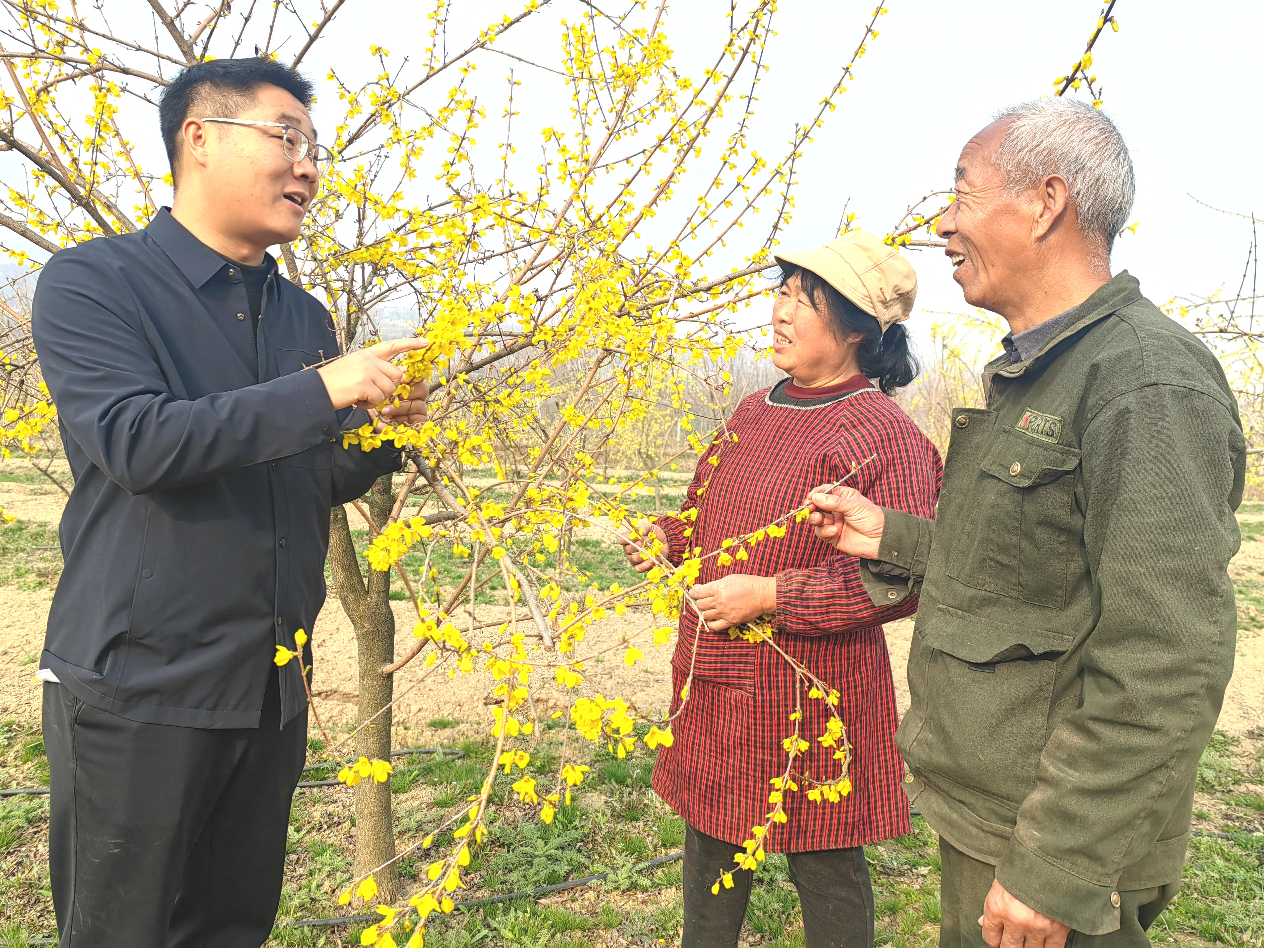返乡创业青年孙鑫(图左)正在指导村民连翘田间管理。邢博 摄