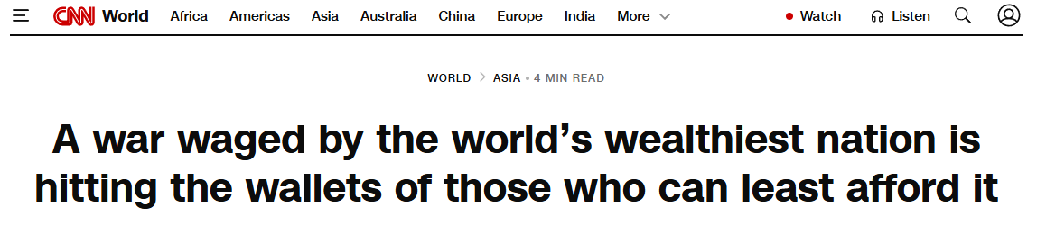 美国有线电视新闻网(CNN)3月13日发表的文章说,全球最富裕国家发动的战争,正在让最无力承受代价的民众买单。