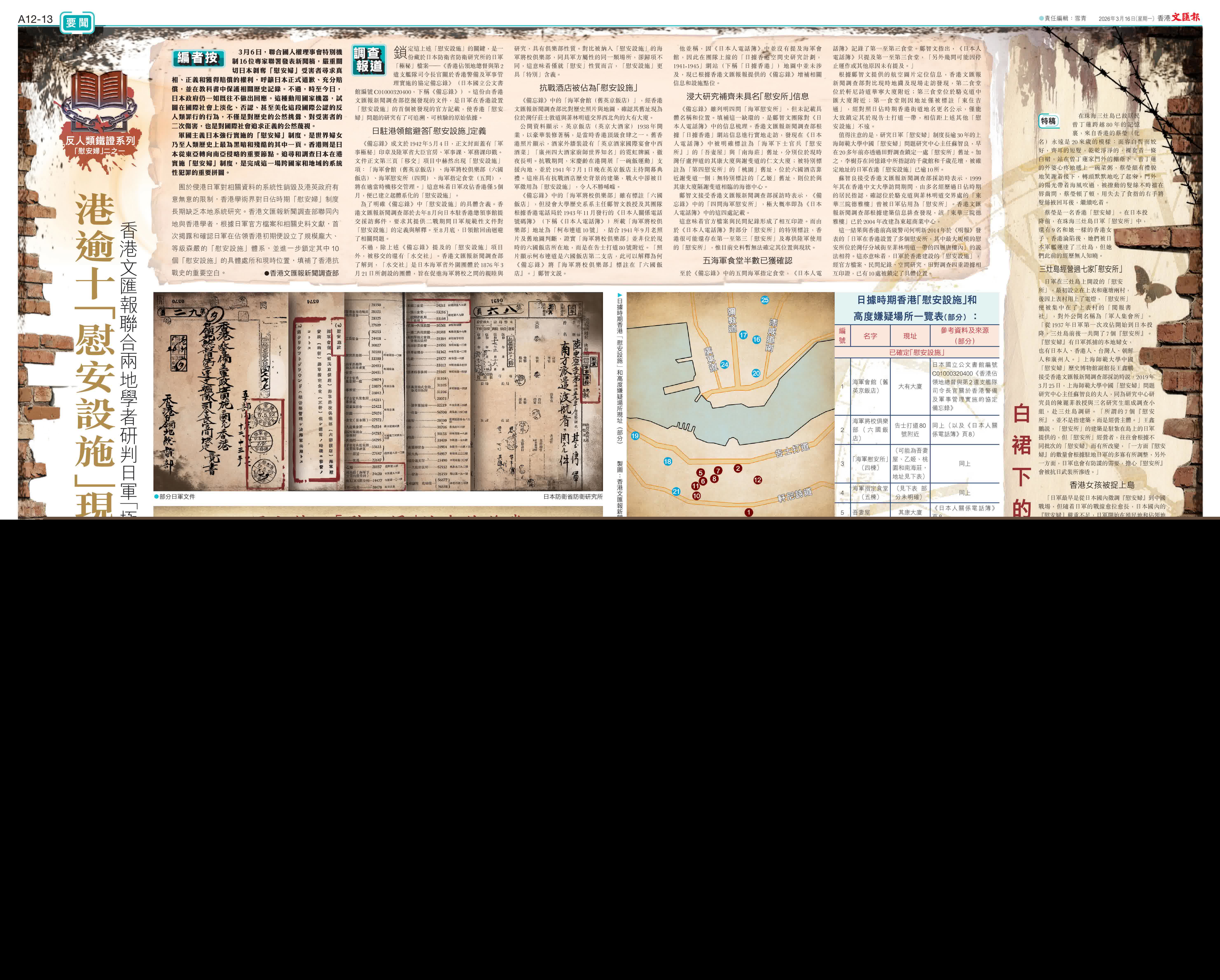 (香港文匯報新聞調查部)囿於侵港日軍對相關資料的系統性銷毀及港英政府有意無意的限制,香港學術界對日佔時期「慰安婦」制度長期缺乏本地系統研究。香港文匯報新聞調查部聯同內地與香港學者,根據日軍官方檔案和相關史料文獻,首次揭露和確認日軍在佔領香港初期便設立了規模龐大、等級森嚴的「慰安設施」體系,並進一步鎖定其中10個「慰安設施」的具體處所和現時位置,填補了香港抗戰史的重要空白。