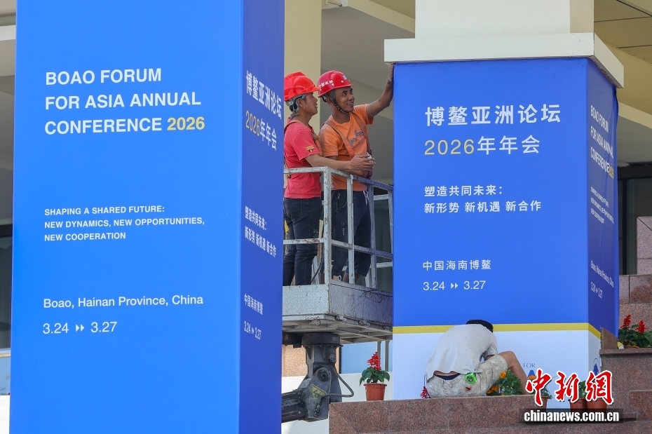 3月17日,博鳌亚洲论坛2026年年会各项筹备工作正有序推进,海南博鳌街头的盛会氛围日渐浓厚。以“塑造共同未来:新形势、新机遇、新合作”为主题的博鳌亚洲论坛2026年年会将于3月24日至27日在海南博鳌召开。图为工作人员在博鳌亚洲论坛永久会址安装年会主题展板。中新社记者 骆云飞 摄