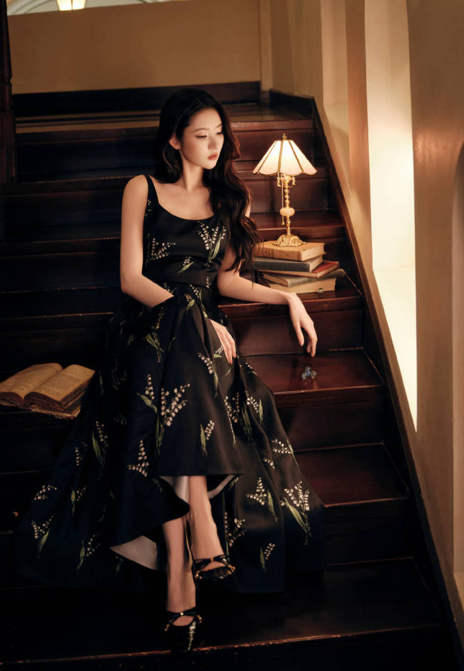 王玉雯卷发配黑底铃兰裙慵懒优雅 光影下复古文艺