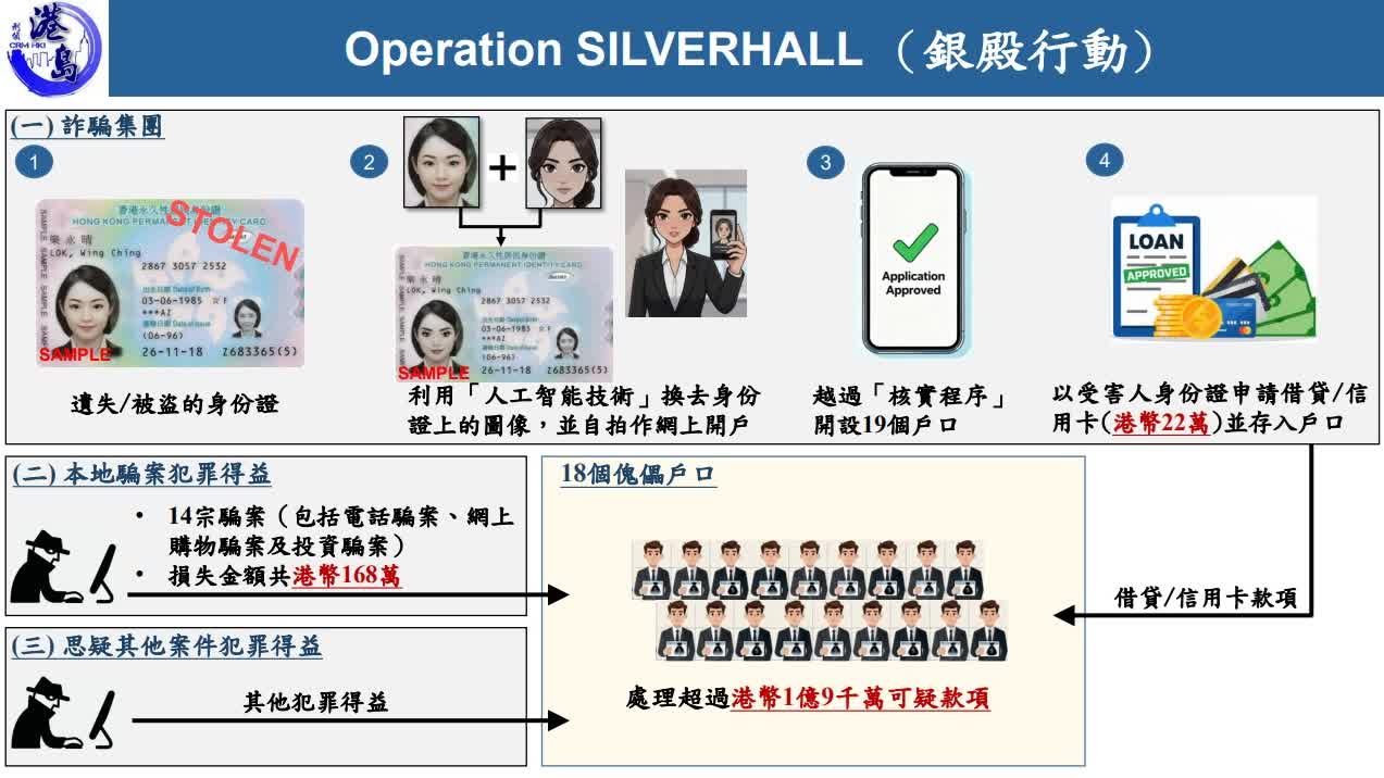 香港文匯報訊(記者 蕭景源)港島總區刑事部人員在過去兩日(10月9日及10日)執行代號「銀殿行動」的情報主導行動,成功瓦解一個本地詐騙集團,並以涉嫌「串謀詐騙」及「洗黑錢」罪,拘捕22名本地人士。該犯罪集團在去年9月至今年4月期間,涉嫌透過「人工智能技術」,利用一些已報失的身份証,非法開設網上銀行戶口,再申請借貸及信用卡,然後再把犯罪得益轉賬至多個傀儡戶口。經初步計算,涉案款項包括所有傀儡戶口處理過的懷疑犯罪得益,總額合共超過港幣1.9億。
