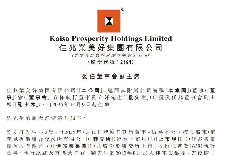 乐居财经 李兰 10月9日,佳兆业美好(02168.HK)发布公告,执行董事刘立好已获委任为董事会副主席。