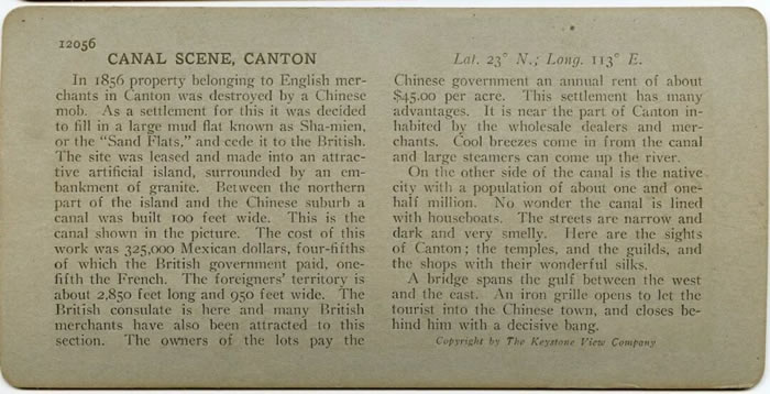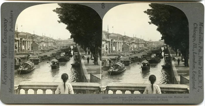 《广州沙面》 詹姆斯.利卡尔顿 银盐立体照片 1900S19世纪广州沙面租界与老城之间的运河景象。这条人工运河是当时中西社区的分界线,一侧是秩序井然的租界,另一侧是舟船云集、人口密集的中国传统城市空间