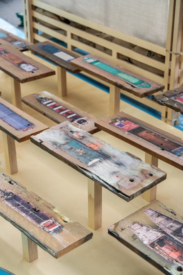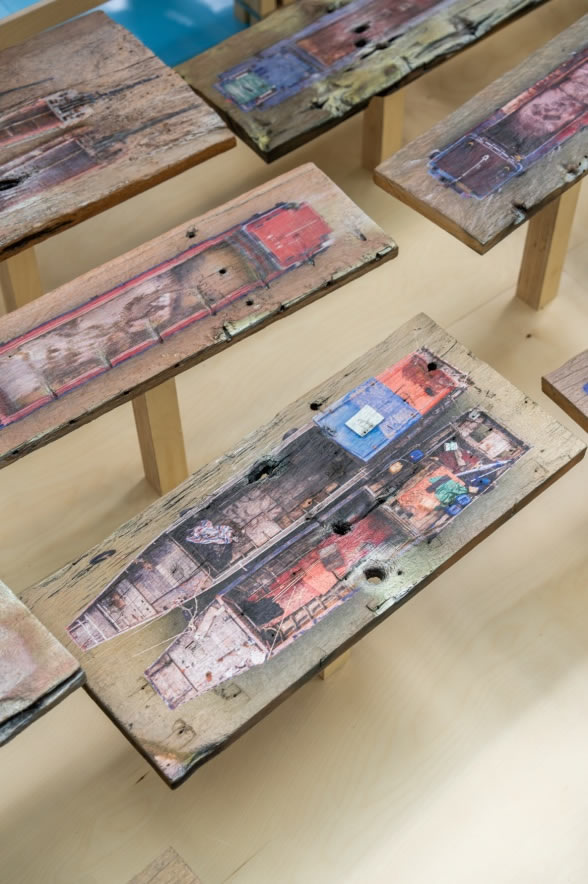 《浮的船》 易连,影像与图片装置,老船木UV打印,4K影像,尺寸可变,2021.从河流中获取的各种船的图像,打印在老船木上,再放回河流中随水漂流。图像通过老船木重新获得了现实空间中的漂流体验。