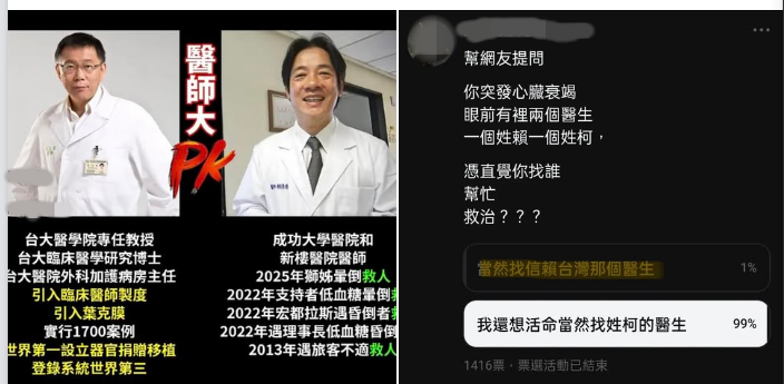 还有岛内网友发起了网络投票:“帮网友提问,你突发心脏衰竭,眼前有两个医生,一个姓柯、一个姓赖,凭直觉,你会找谁帮忙救治?”结果共投出1416票,仅有1%的网友选择“当然找信赖台湾那个医生”,而99%的网友则投给“我还想活命,当然找姓柯的医生!”也有网友粉丝专页放出“柯、赖医师大PK”对照图,左边是柯文哲的丰富医界经历,右边则是赖清德的医师简历,网友直呼:没比较没伤害。岛内网友纷纷呛说“右边就是cos(角色扮演)医生”“救人无数的才不会整天嚷嚷自己救多少人”“不是喔,不是这样子算赢喔!”(编辑/白芷)