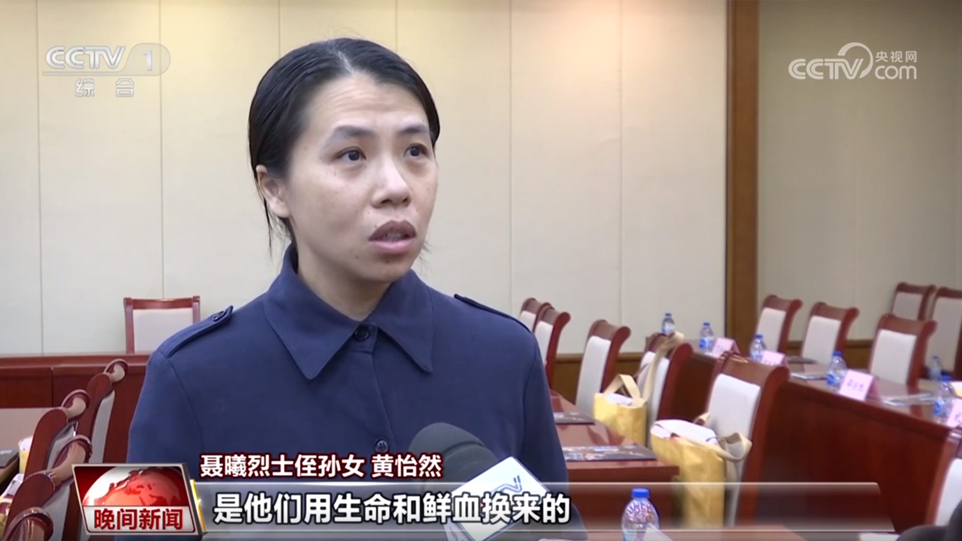聂曦烈士侄孙女 黄怡然:也许还有很多英雄,他的名字根本就无人知晓。我们今天的这个和平盛世,是他们用生命和鲜血换来的。我们也特别欣慰,觉得今天的盛世如他们所愿。