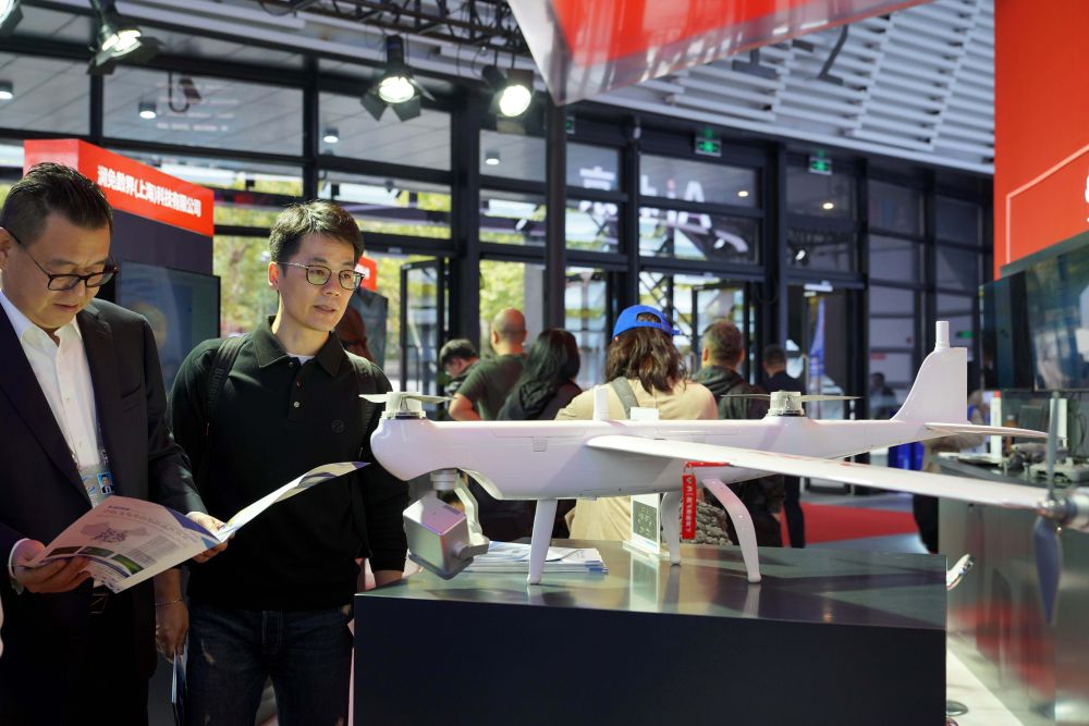 ↑ 11月6日,嘉宾在观看可提供空中巡检服务的“道通龙鱼 Pro”垂直起降固定翼。新华社记者赵宇思摄