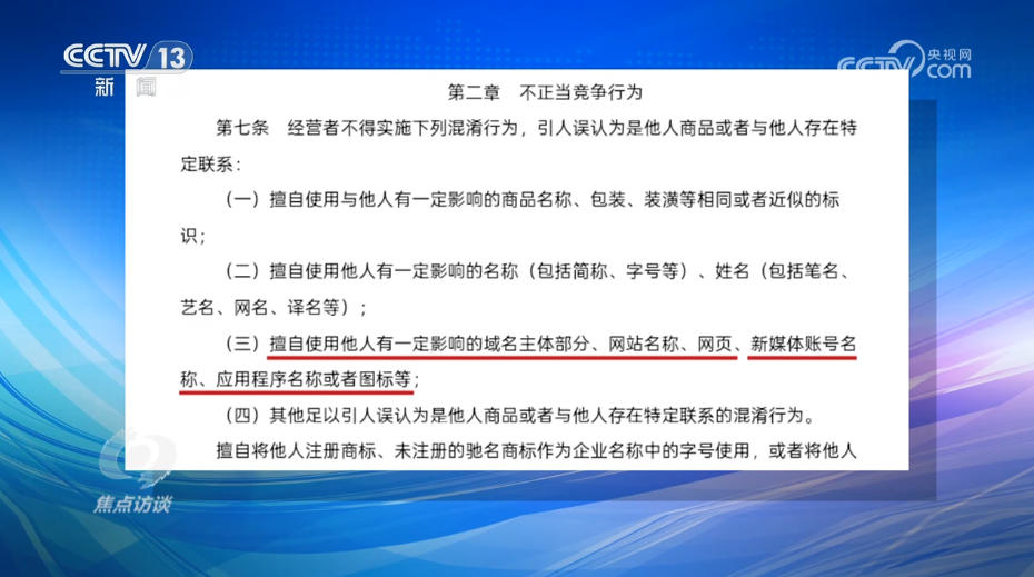 这种利用他人账号、类似的App图标或直接用他人的视频,进行“张冠李戴”的不正当“内卷”行为如今将得到更精准的打击。新版的反不正当竞争法在经营者不得“擅自使用他人有一定影响的域名主体部分、网站名称、网页”条款中新增了“新媒体账号名称、应用程序名称或者图标等”。