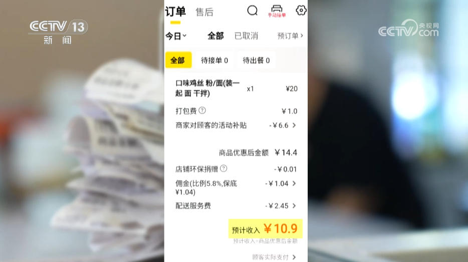 湖南长沙一家快餐店老板给记者算了一笔账,以一份20元口味鸡丝面为例,商家要承担对顾客活动补贴6.6元、平台佣金1.04元以及配送服务费2.45元,预计收入约为商品原价的一半。