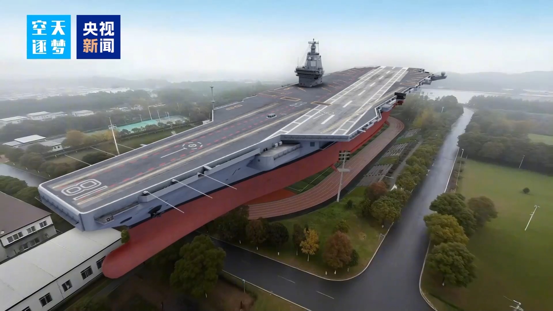 四年前,我们曾拍摄山东舰,但镜头未能充分展现其五万吨的磅礴体量。如今,福建舰更大,如何让人直观感受?我们选择将它“置于”陆地,在熟悉场景中体会其宏伟。
