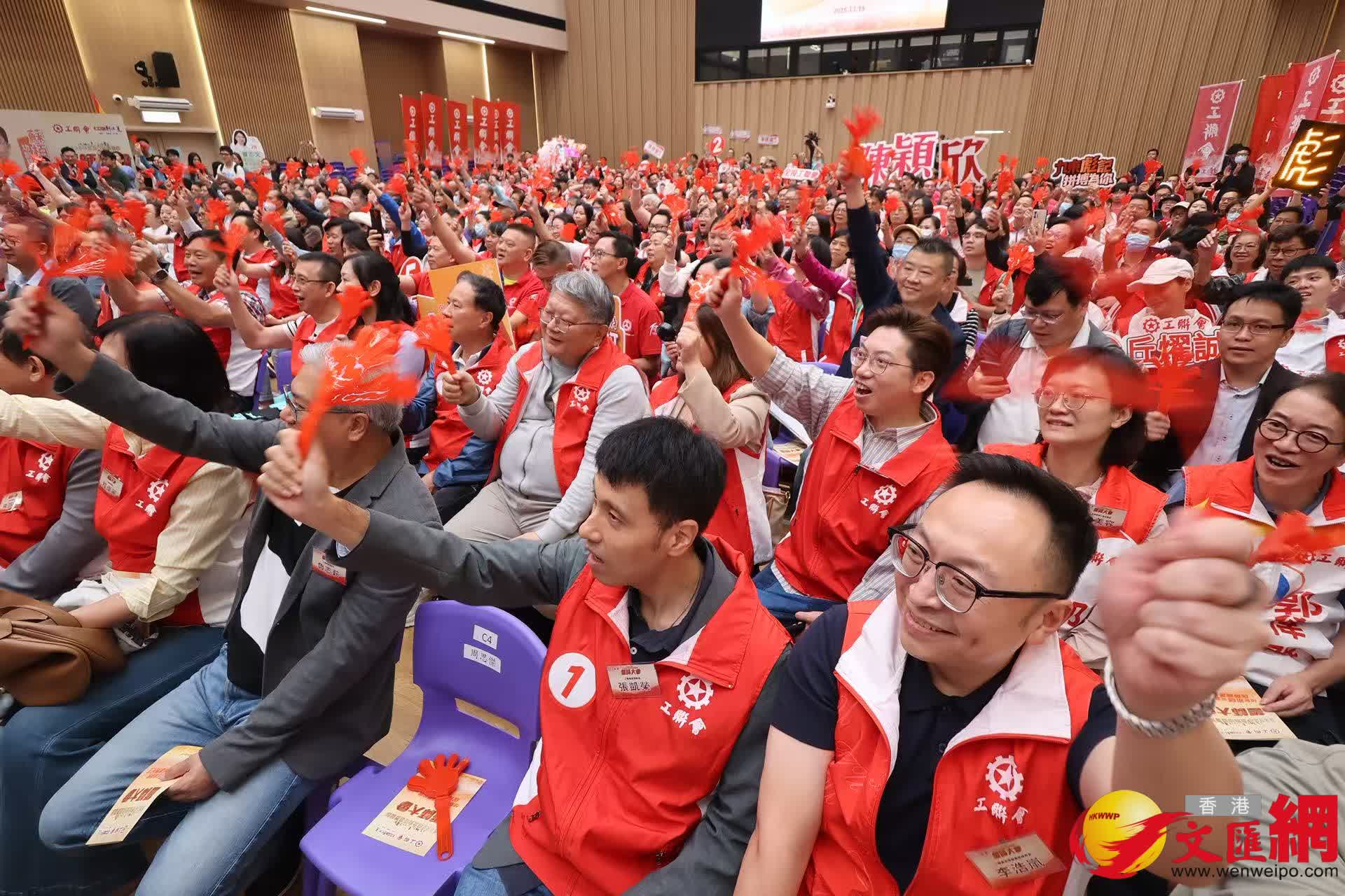 香港文匯報訊(記者 田至韌)工聯會今日(15日)下午2點半,在創知中學禮堂舉辦誓師大會。地區直選界別候選人、選舉委員會界別候選人、功能界別(勞工界)候選人及一眾義工近千人參加,所有人身穿紅色工聯會服裝,現場呈現一片「紅海」。