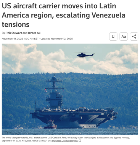 △《纽约时报》报道,美国最先进的“福特”号航母日前进入加勒比海区域,美国政府正在考虑采取进一步军事行动,旨在推翻马杜罗政权。