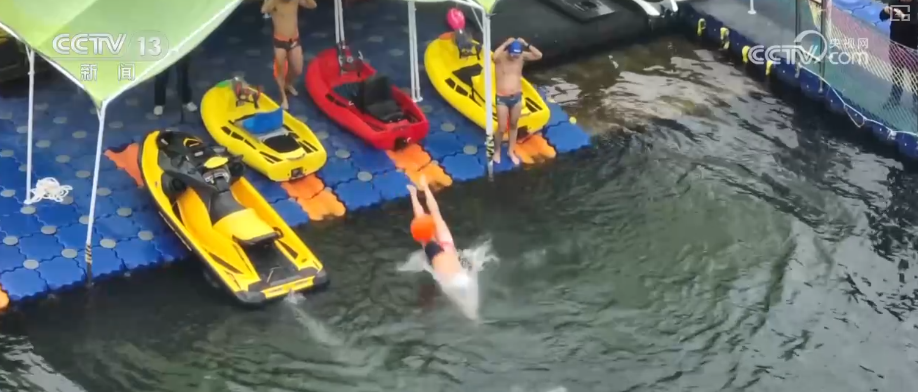 立冬时节,在浙江金华浦江县的一处水库的安全区域,游泳爱好者们正为今冬的第一次冬泳热身。