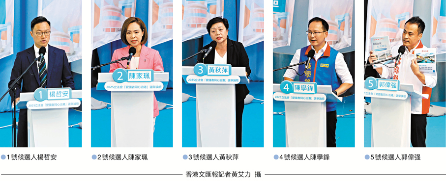 (大公文匯全媒體記者 張茗、陸九如)港島西擁有美麗島嶼、海景和漁民文化,如何發展海島和海濱成為市民關注的議題。於昨日舉行的立法會港島西地方選區論壇中,5位候選人:自由黨楊哲安、新民黨陳家珮、無申報政治聯繫的黃秋萍、民建聯陳學鋒和工聯會郭偉强於辯論環節上,就「關於推進海濱發展,應如何在海港保護、旅遊經濟發展、民生需要等取得平衡,有什麼具體主張和措施」發表意見。其間,身兼中西區區議員的4號陳學鋒和聲稱在當區成長的1號楊哲安「你來我往」,擦出火花,良性互動。