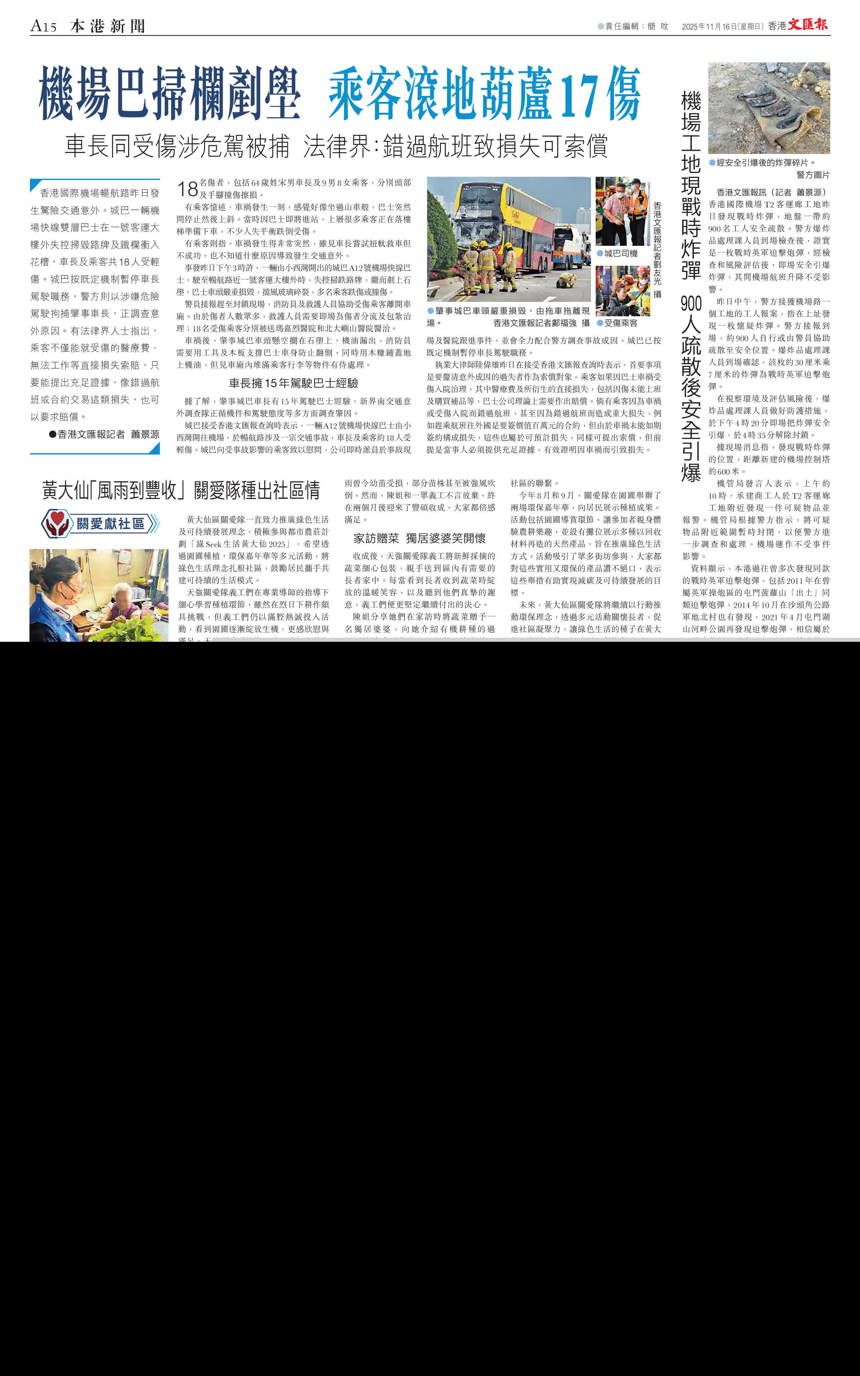 (香港文匯報記者 蕭景源)香港國際機場暢航路昨日發生驚險交通意外。城巴一輛機場快線雙層巴士在一號客運大樓外失控掃毀路牌及鐵欄衝入花槽,車長及乘客共18人受輕傷。城巴按既定機制暫停車長駕駛職務,警方則以涉嫌危險駕駛拘捕肇事車長,正調查意外原因。有法律界人士指出,乘客不僅能就受傷的醫療費、無法工作等直接損失索賠,只要能提出充足證據,像錯過航班或合約交易這類損失,也可以要求賠償。