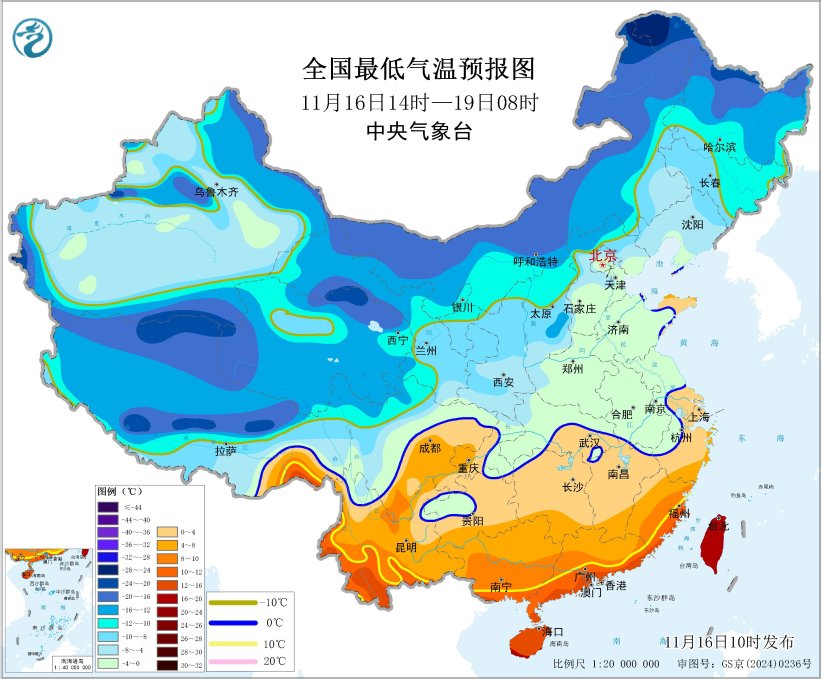央视网消息:中央气象台11月16日10时继续发布寒潮蓝色预警:受寒潮影响,预计,11月16日至18日,我国中东部地区将自北向南出现大风降温天气,日平均或最低气温普遍下降6~10℃,陕西南部、重庆北部、河南西部和南部、湖北西部和北部等地下降12~14℃,局地降温可超过16℃。18日前后,最低温度0℃线将南压到苏皖南部至湖北中部一带。