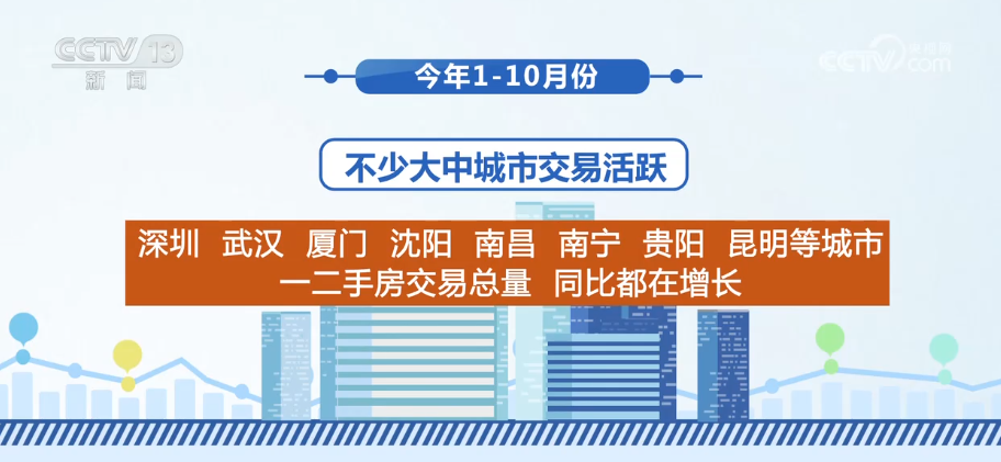 记者从住房城乡建设部获取的数据显示,1—10月份,全国新建商品房和二手房交易总量同比仅下降1.9%,基本保持稳定,没有出现明显收缩。与此同时,不少大中城市交易活跃,深圳、武汉、厦门、沈阳、南昌、南宁、贵阳、昆明等城市的一二手房交易总量,同比都在增长。