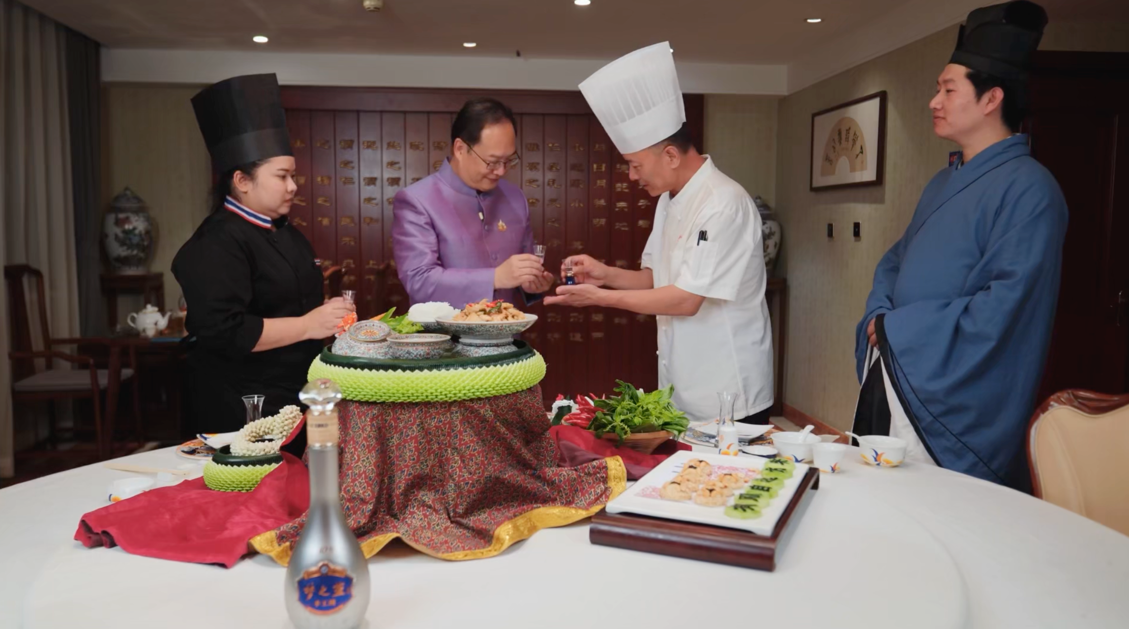 当泰国驻华大使韩灿才踏入孔府菜会场的那一刻,这波文化输出直接把“排面”焊在了餐桌上。刚进门就被孔府菜大厨递上梦之蓝手工班欢迎老酒,礼官开启“传统文化小课堂”,一套源自周礼的“一献之礼”看得人眼花缭乱。