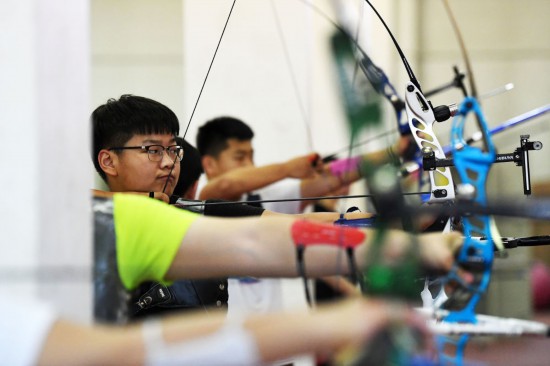 2020年6月3日,济南市体校学生李梦麒在进行射箭训练。新华社记者 王凯 摄