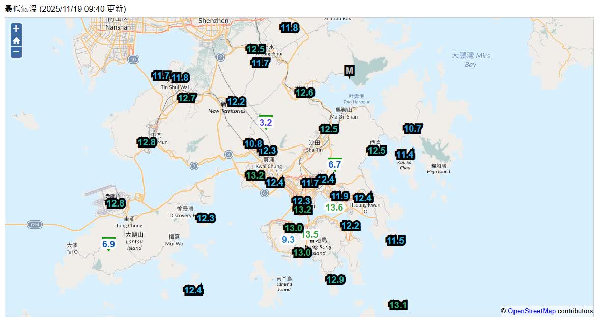 本港地區今日(19日)天氣預測大致多雲,早上相當清涼及有一兩陣微雨,最低氣溫13.2度,大部分地區的氣溫相比昨天朝早時間,低8至10度,明顯轉凍,再加上大風,風寒效應尤其顯著。天文台指,今日日間最高氣溫約17度,天氣非常乾燥,吹清勁偏北風,離岸及高地吹強風,稍後風勢緩和。