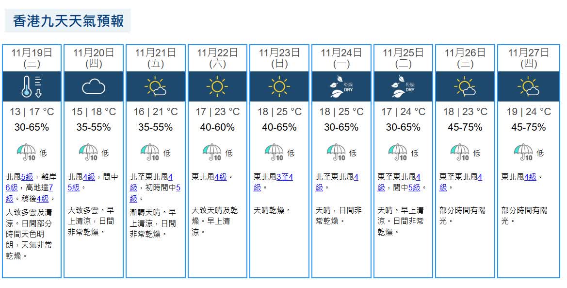 展望本港明日(星期四)大致多雲,早上仍然清涼,日間非常乾燥,氣溫介乎15至18度。隨後數日漸轉天晴,氣溫逐步回升。星期五(21日)天氣漸轉天晴,早上清涼,日間非常乾燥,氣溫介乎16至21度。星期六(22日)天氣大致天晴及乾燥,早上清涼,氣溫稍稍回升,介乎17至23度。