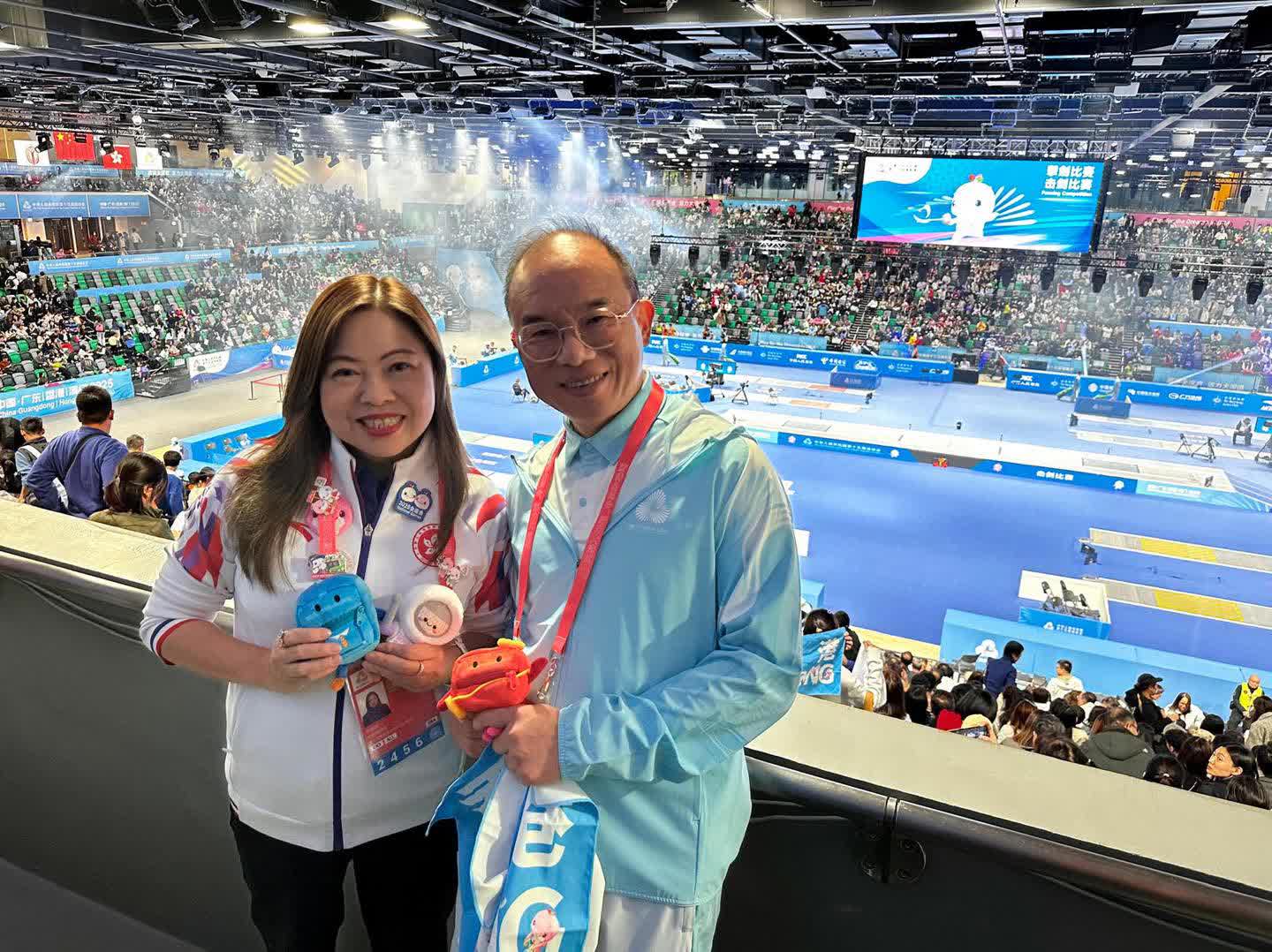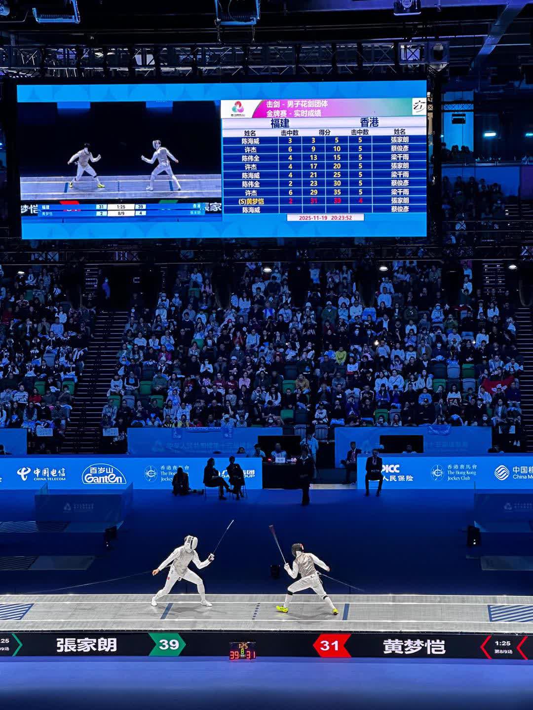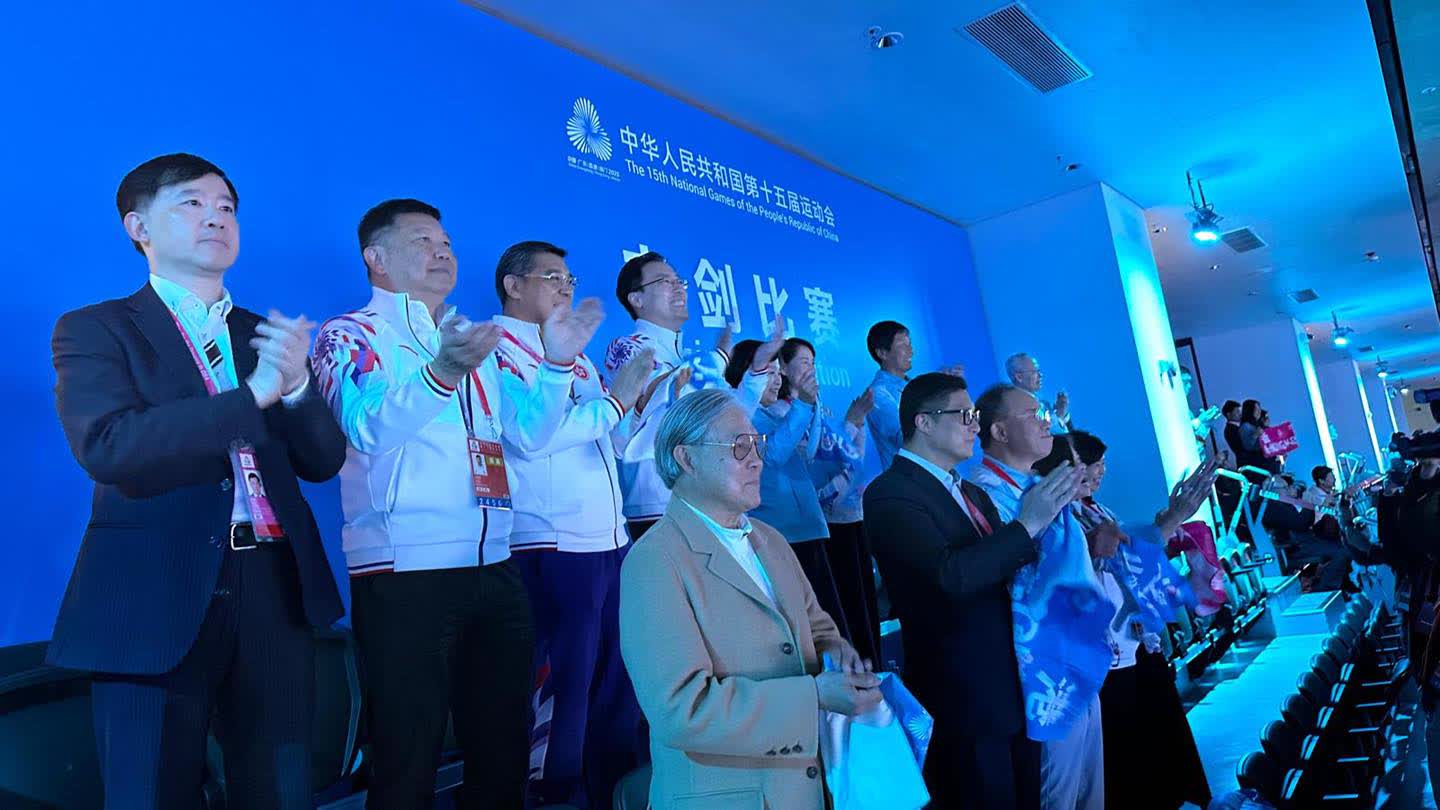 今晚(19日),十五運會再度傳來喜訊,香港劍擊隊在男子花劍團體賽決賽中主場,以45:34擊敗福建隊,取得港隊歷來首面全運會劍擊金牌。今晚政制及內地事務局局長曾國衞和副局長胡健民親身來到決賽現場,與幾位局長,包括保安局鄧炳強局長、民政青年事務局麥美娟局長、文化體育及旅遊局羅淑佩局長、房屋局何永賢局長以及教育局蔡若蓮局長,一齊為香港隊打氣,並與全場觀眾一同見證歷史性的一刻。