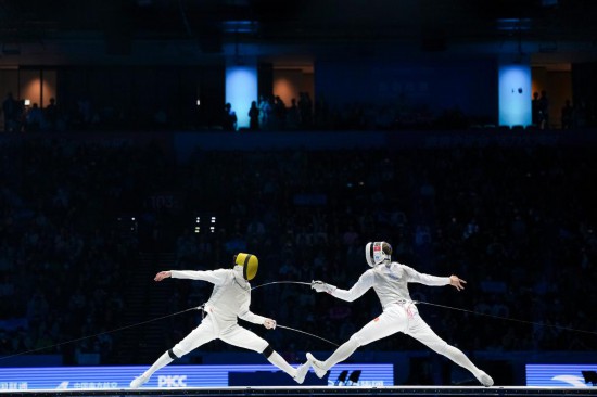 11月19日,香港队选手张家朗(右)和福建队选手陈海威在比赛中。新华社记者 吴鲁 摄