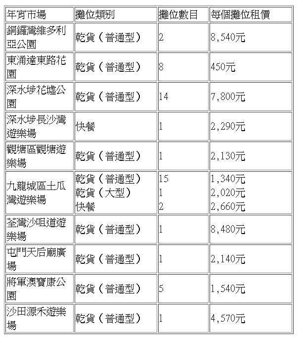 52個空置攤位所在地點及出租價格如下: