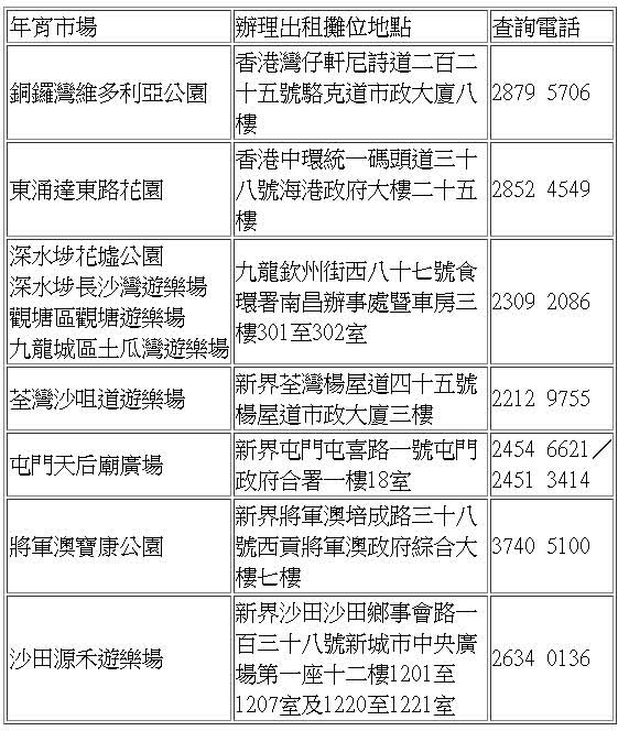 有意租用餘下年宵攤位的市民,須在上述申請租用日期內,於上午9時30分至下午12時30分或下午2時30分至4時30分親自前往下列食環署辦事處辦理手續: