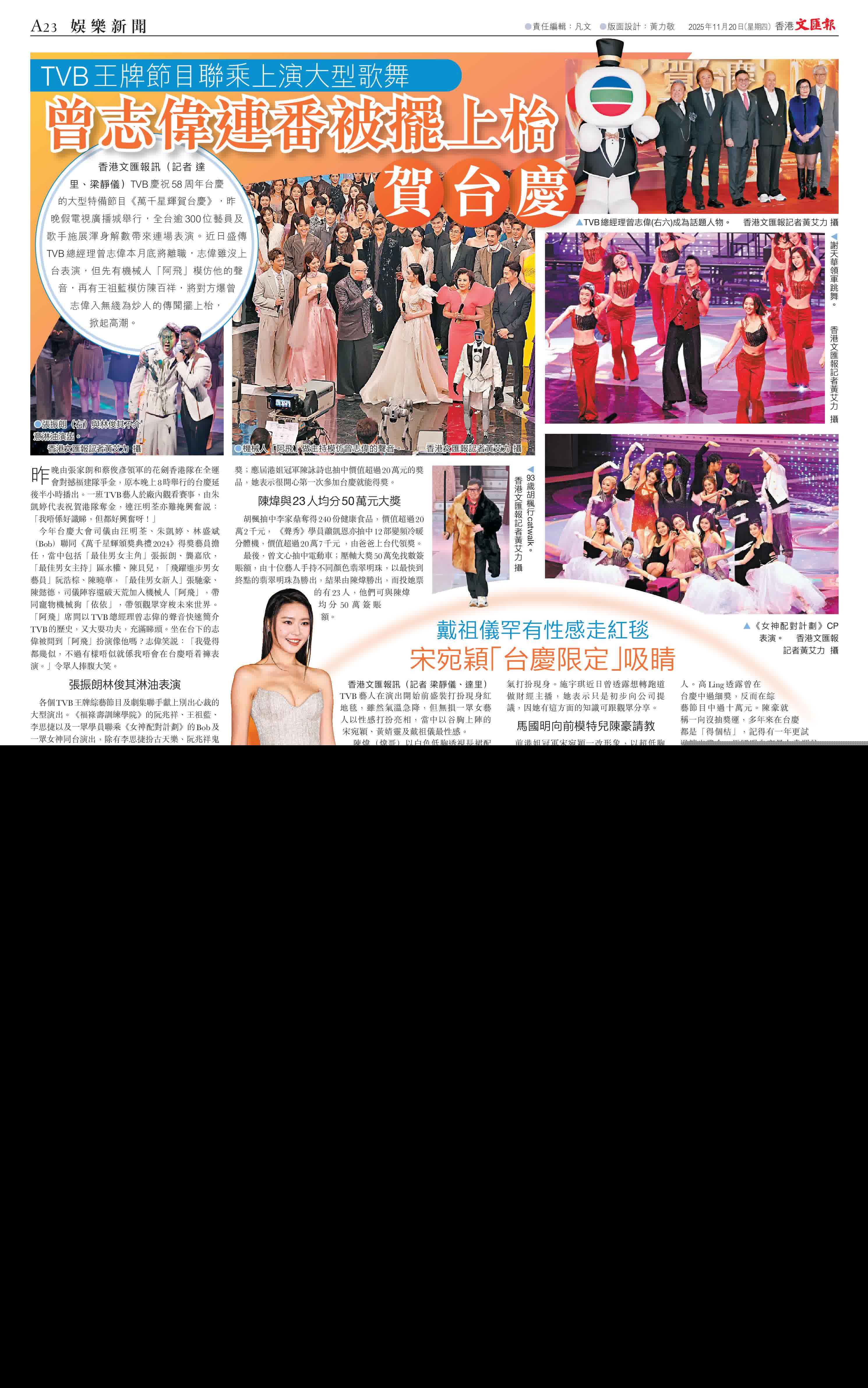 香港文匯報訊(記者 達里、梁靜儀)TVB慶祝58周年台慶的大型特備節目《萬千星輝賀台慶》,昨晚假電視廣播城舉行,全台逾300位藝員及歌手施展渾身解數帶來連場表演。近日盛傳TVB總經理曾志偉本月底將離職,志偉雖沒上台表演,但先有機械人「阿飛」模仿他的聲音,再有王祖藍模仿陳百祥,將對方爆曾志偉入無綫為炒人的傳聞擺上枱,掀起高潮。