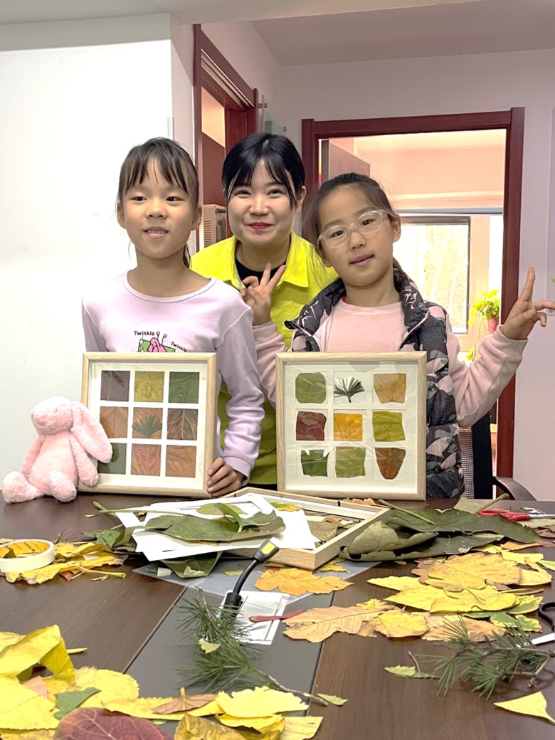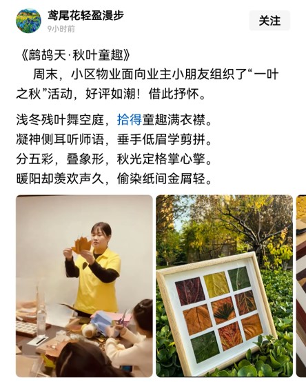 其中,博轩园的“博叶志”成为爆款——灵感源自矿物标本相框,收录了小区全部24种树叶品种、“每一栋楼都有专属的落叶”。小区物业服务团队与公司层面绿化专家一起逐栋排查,集齐特色落叶,更邀请业主共同参与寻叶和制作。每片叶子均标注对应楼栋与树种信息,让每位业主都能找到自家楼栋的专属印记,拉满归属感,又以自然科普为载体,助力家长引导孩子认叶护绿,更有业主为落叶活动写诗一首,这些都凝结着物业与业主共建家园的暖情温度。